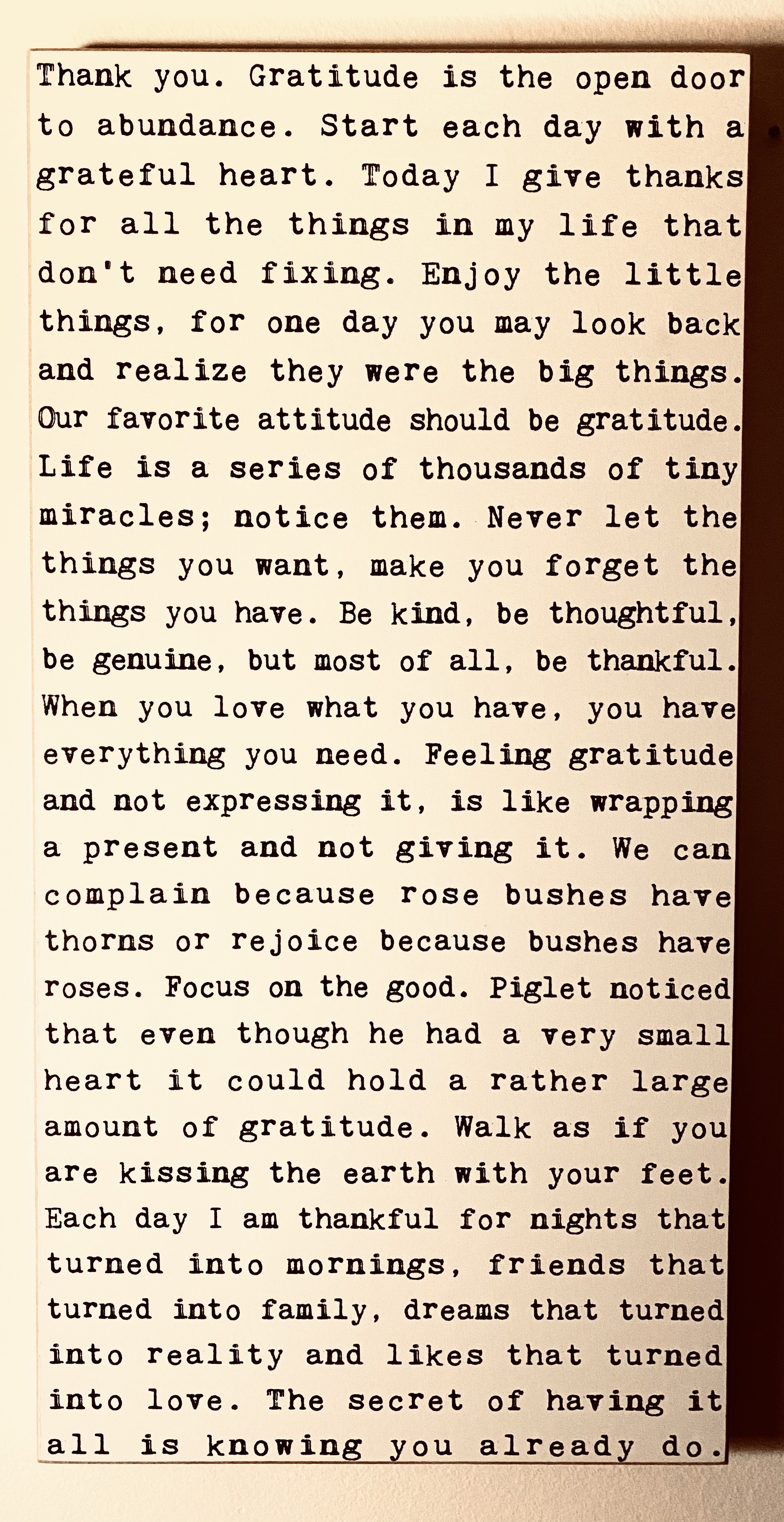 This frame resides in my meditation room, and often inspires me to hold the intention to have an attitude of gratitude. Each time I read it, depending on the state of my mind, a particular sentence stands out to me. For example, one of the sentences I love in this is about Piglet. I loved reading Winnie the pooh to my daughter, and we both love the stories so much that we have continued returning to them often. Piglet’s character in particular is one I can resonate with: like Piglet, I am afraid easily – I am scared of roller coasters, of swimming in the deep, of horror movies and when I was a child, I was afraid of loud fire-crackers, of the dark and many other things. And yet Piglet experienced what it was like to be brave and to be accepted for who he was. And Piglet’s heart can hold enormous amount of gratitude.